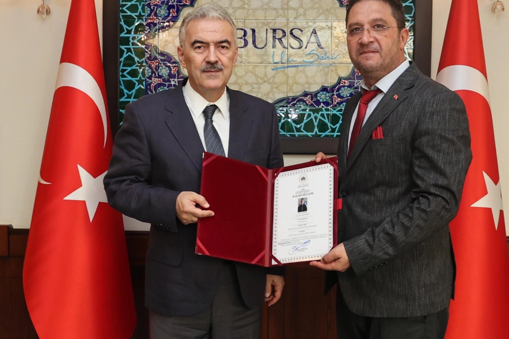 Ziyaret sırasında Vali Ayyıldız, Bursa’da görev yaptığı süre boyunca gerçekleştirdiği başarılı çalışmalar ve kuruma katkılarından dolayı Osman Başeğmez’e teşekkür ederek, kendisine başarı belgesi takdim etti.