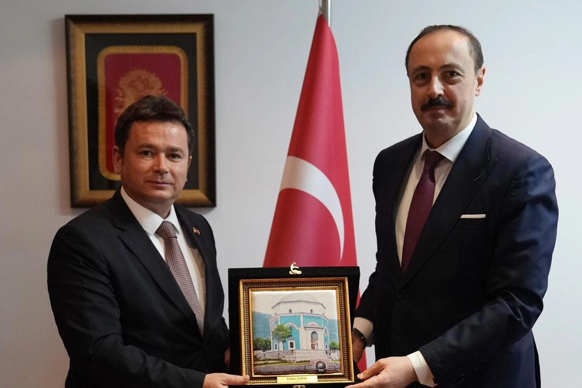 Başkan Aydın’dan Üsküp Büyükelçisi Fatih Ulusoy’a ziyaret Osmangazi Belediye Başkanı Erkan Aydın, ‘Osmangazi Kardeşler Buluşması’ etkinliği kapsamında gittiği Üsküp’te Türkiye Cumhuriyeti’nin Üsküp Büyükelçisi Fatih Ulusoy’u ziyaret etti. Ziyarette Başkan Aydın’a Osmangazi Belediyespor Yönetim Kurulu Başkanı Fatih Karayılan, Osmangazi Belediye Başkan Yardımcısı Tolga Kornoşor ve KKTC Akademi Sanat Derneği Başkanı Gencay Eroğlu da eşlik etti. Misafirperverliği için Büyükelçi Fatih Ulusoy’a teşekkürlerini sunan Başkan Aydın, "İkili ilişkilerin geliştirilmesi, kültürel birlikteliğin sağlanması ve ortak projeler üzerine fikir alışverişinde bulunduğumuz verimli bir ziyaret oldu. Sayın Büyükelçimize nazik ev sahipliği ve samimi ilgisinden dolayı kendisine teşekkür ediyorum" dedi. Ziyaretten dolayı mutluluk duyduğunu ifade eden Türkiye Cumhuriyeti’nin Üsküp Büyükelçisi Fatih Ulusoy ise, "Balkanlar’da ülkemize yönelik güzel bir teveccüh var. Her gittiğimiz yerde güzel bir şekilde karşılanıyoruz. Sizlerin de buralara gelmeniz ve düzenlediğiniz etkinlikler ile bağları güçlendirmeniz Türkiye’ye olan sevgiye de katkı sağlıyor" diye konuştu.