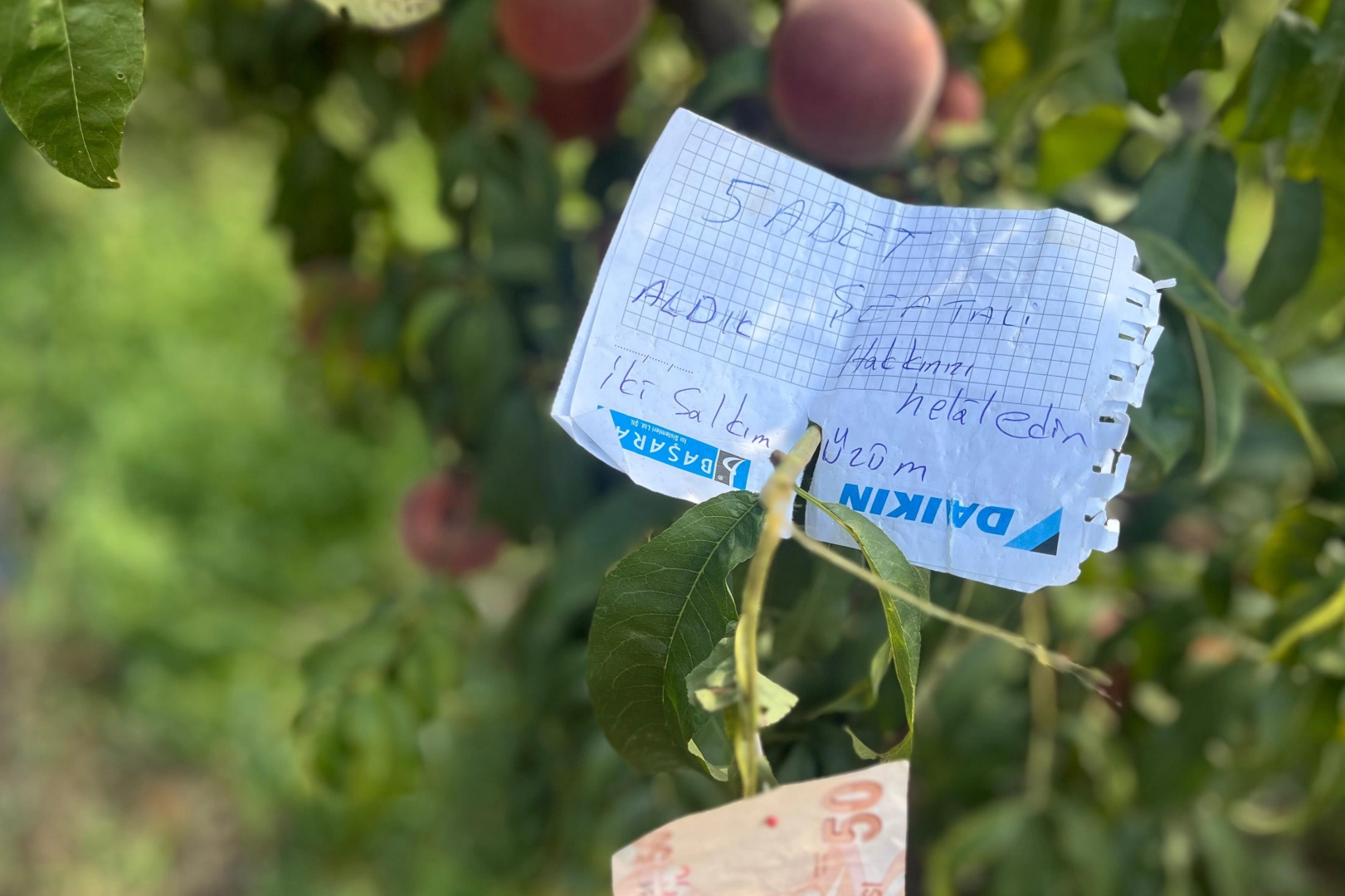 Genç çiftçi, şeftali ağacında bir not ve yanında bir miktar para buldu. Notta, "5 adet şeftali ve 2 salkım üzüm aldık, hakkınızı helal edin" yazılıydı. Berkan Gergin, notu ve parayı bulduğunda çok duygulandığını belirtti.