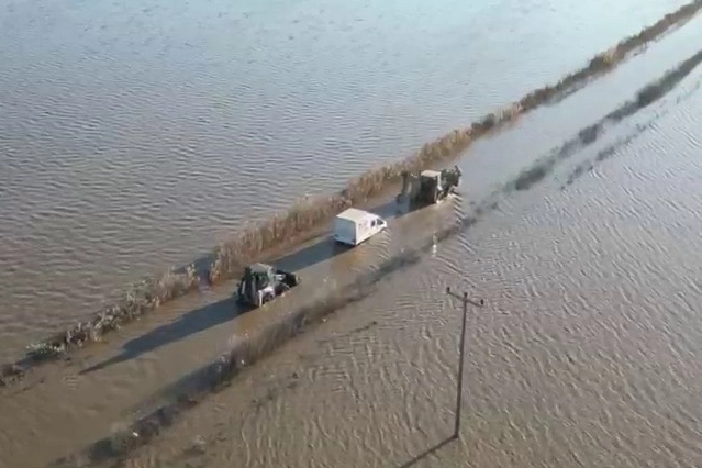 Bursa'nın Karacabey ilçesinde eriyen kar sularının dereyi taşırması sonucu yol sular altında kaldı. Araçta mahsur kalan vatandaş ekiplerce kurtarılırken, binlerce dönüm ekili tarım arazisi sular altında kaldı. O anlar dron ile görüntülendi.