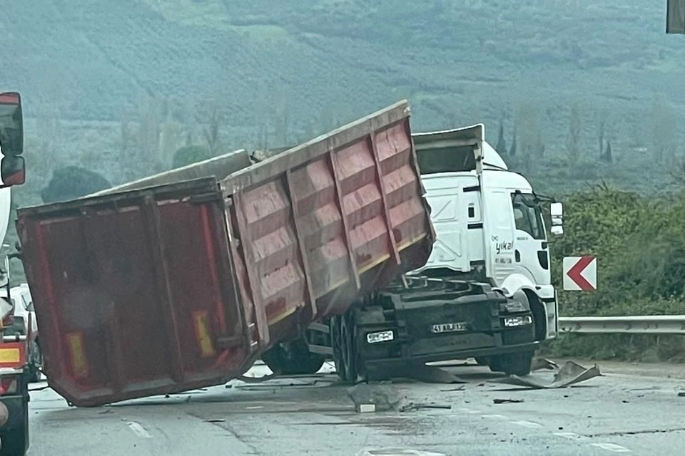 Bursa'nın Gemlik ilçesinde seyir halindeki tırın damperi açılarak üst geçide çarptı.