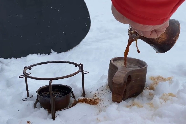 Bursa'da bir sosyal medya fenomeni, Uludağ'da kar üzerinde Türk Kahvesi pişirdi, snowboard yaparken de keyifle yudumladı.