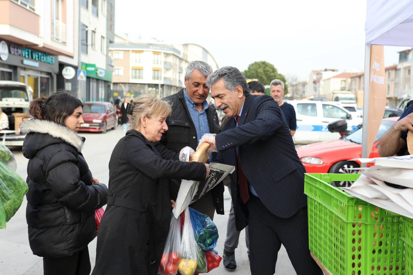 Başkan Deviren, Başkan Yardımcısı Durmuş Uslu ve belediye meclis üyeleriyle birlikte pazar yerinde iftar öncesinde hemşehrilerine pide ikram etti.