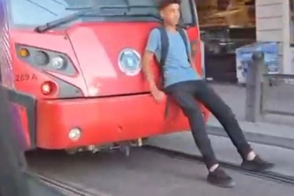 Yoğun trafikte, tramvayın arka kısmına oturup ayaklarını yere sürterek tehlikeli bir şekilde seyahat eden çocuk, görenleri hayrete düşürdü. Çocuğun bu tehlikeli yolculuğu, trafikteki bir vatandaş tarafından cep telefonu kamerasıyla kaydedildi.
