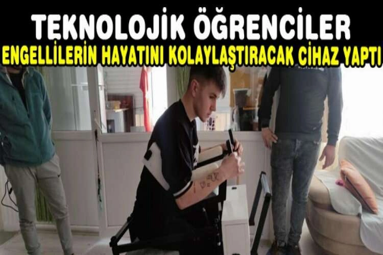 Bir abla yatağa bağımlı kardeşini daha rahat taşıyabilmek için Gemlik Mesleki Eğitim Merkezi Makine Teknolojileri ve Elektrik Elektronik öğrencilerinden kendilerine elektrikli cihaz yapmasını istedi. Gelen talep üzerine öğrenciler; elektrikle çalışan ve yatağa bağımlı hastaların daha rahat ihtiyaçlarını girebileceği cihaz tasarladı. Elektrikli cihaz, yürüyemeyen yatalak hastayı elektrikli aparatı sayesinde bulunduğu yerden kaldırıp taşıyor. Düşük bütçe kullanılarak öğrenciler tarafından tasarlanan sandalye, hasta yakınlarına teslim ediliyor. Bu cihaz sayesinde hastalar yakınlarına daha az yük olarak rahat rahat lavaboya gidip gelebiliyor. Gelen talep üzerine böyle bir cihaz tasarladıklarını ifade eden Gemlik Mesleki Eğitim Merkezi Müdürü Cengiz Korucu, "Bir abla okulumuza gelerek engelli kardeşini taşırken zorluk çektiğini ve onu zorlanmadan taşıyabileceği cihaz yapmamızı istedi. Okulumuzun Makine Teknolojileri ve Elektrik Elektronik bölümü öğrenci ve öğretmenlerimizin desteğiyle bedensel engelli bir kişiyi yatağından lavaboya, oradan tekrar yatağına taşımak için bir cihaz tasarladık" dedi. Engellilerin hayatını kolaylaştıracak böyle bir cihaz yaptıkları için çok mutlu olduklarını ifade eden öğrenciler, "Tasarladığımız bu cihaz sayesinde engelli kardeşlerimiz lavaboya daha rahat gidip gelebilecekler. Yakınlarına daha az yük olacaklar, onlar mutlu olunca biz de mutlu oluyoruz" şeklinde konuştu.
