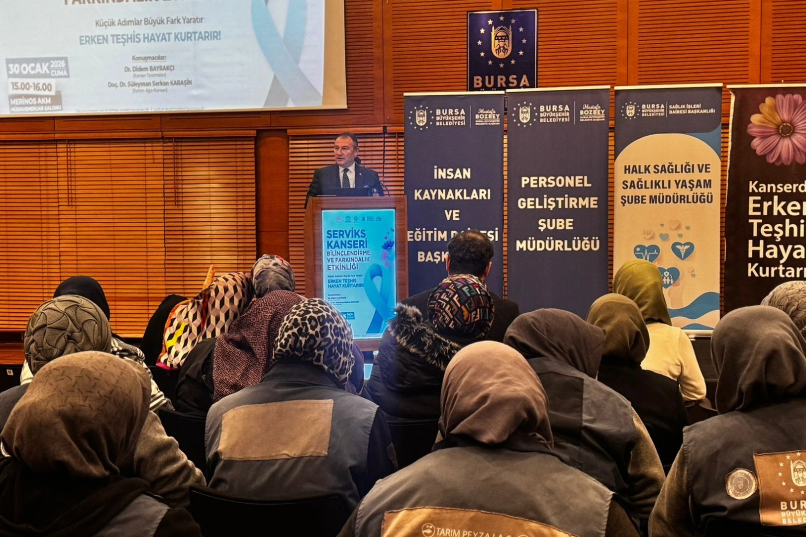 Dünyada ve Türkiye'de kadın sağlığını tehdit eden önemli hastalıklar arasında yer alan rahim ağzı (serviks) kanserine karşı erken teşhisin hayati önem taşıdığına dikkat çekildi. Ocak ayının 'Serviks Kanseri Farkındalık Ayı' olarak kabul edilmesi kapsamında, Bursa Büyükşehir Belediyesi tarafından kadın çalışanlara yönelik ‘Serviks Kanseri Bilinçlendirme ve Farkındalık Etkinliği' düzenlendi. İnsan Kaynakları ve Eğitim Dairesi Başkanlığı ile Sağlık İşleri Dairesi Başkanlığı iş birliğinde, İl Sağlık Müdürlüğü'nün desteğiyle gerçekleştirilen program, Atatürk Kültür Merkezi Merinos Yerleşkesi'nde yapıldı. Kadınlar arasında en sık görülen kanser türlerinden biri olan rahim ağzı kanserinin, düzenli tarama testleri sayesinde büyük oranda önlenebildiği ya da erken evrede teşhis edilebildiği vurgulanan etkinlikte, hastalıkla ilgili toplumsal farkındalığın artırılmasının önemi ele alındı. Programda Dr. Didem Bayrakçı, serviks kanseri taramaları, HPV testi ve smear testinin erken teşhisteki rolüne ilişkin bilgiler verdi. Doç. Dr. Süleyman Serkan Karaşin ise rahim ağzı kanserinin nedenleri, risk faktörleri, korunma yöntemleri ve güncel tedavi yaklaşımlarını katılımcılarla paylaştı. Sunumların ardından katılımcılar, merak ettikleri konular hakkında uzmanlara soru sorma imkânı buldu. Etkinliğe katılan Bursa Büyükşehir Belediyesi Genel Sekreter Yardımcısı Mehmet Emin Direkçi, rahim ağzı kanserinin önlenebilir bir hastalık olduğuna dikkat çekerek, "Kadınların sağlık konusunda bilinçlenmesi, güçlü ve sağlıklı bir toplumun temelini oluşturur. Erken teşhis hayat kurtarır ve bu bilincin toplumun her kesimine yayılması büyük önem taşımaktadır" dedi. Direkçi, Bursa Büyükşehir Belediyesi olarak önleyici sağlık hizmetlerini ve farkındalık çalışmalarını kararlılıkla sürdürdüklerini ifade etti.