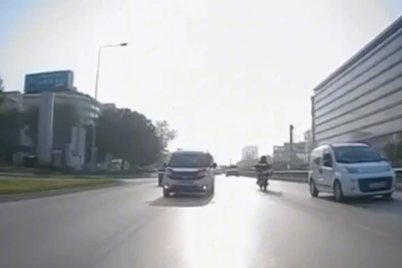 Sürücüsü ve plakası henüz öğrenilemeyen hafif ticari araç, seyir halinde olan diğer araçları hiçe sayarak makas atmaya başladı. Tehlikeli anlar ise saniye saniye araç içi kamerasına yansıdı.