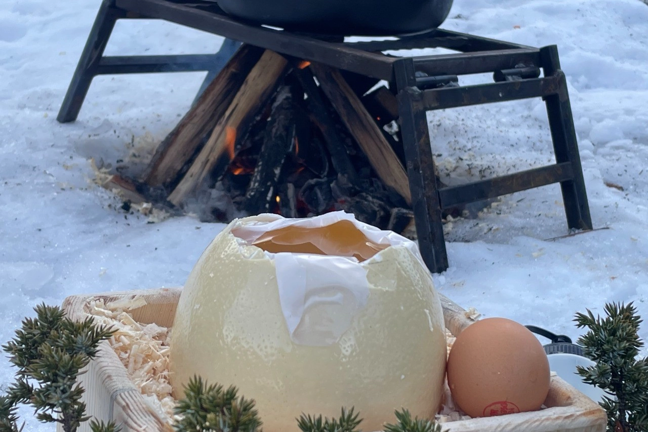 Bursa'da doğada yemek yapan 53 yaşındaki Süleyman Ateştepe, yaklaşık 1500 kilometre uzaklıktaki Ağrı Dağı eteklerinden getirttiği deve kuşu yumurtasını Uludağ'da karlar üzerinde yaktığı ateşte tavada pişirdi.