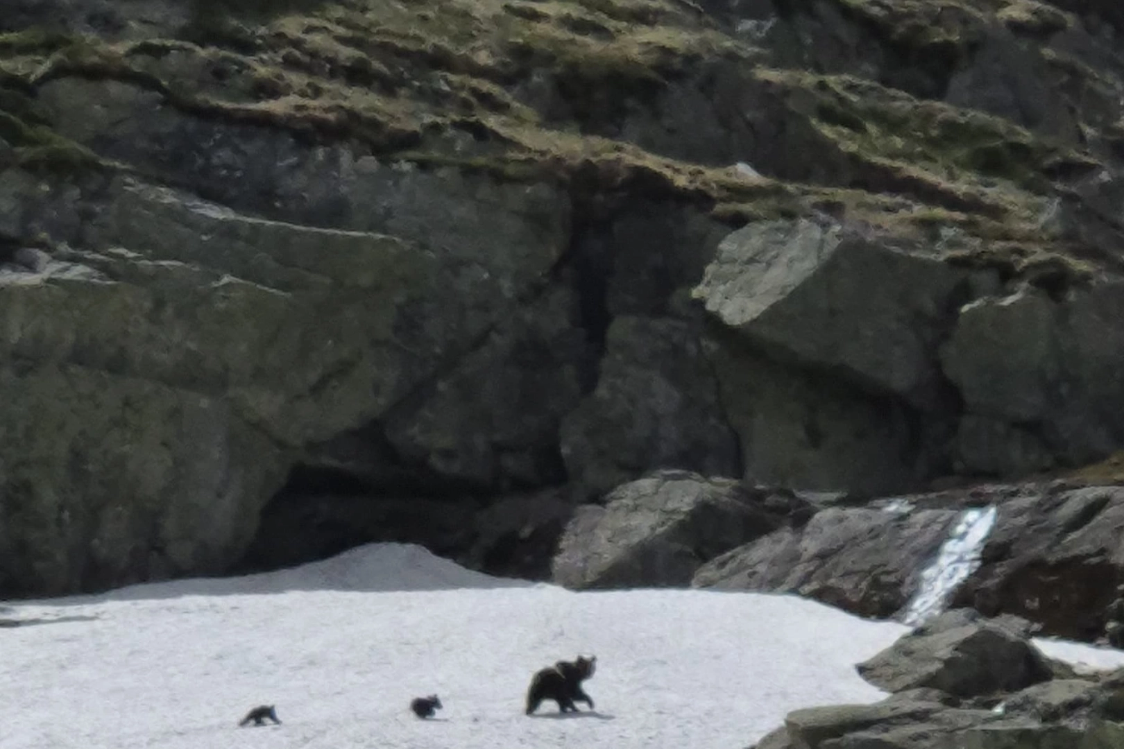 Mevsimlerin kayması sebebiyle havaların geç ısındığı hatta karın hala erimediği zirvede kış uykusunu tamamlayıp kaldıkları mağaradan çıkan anne ayı ve 2 yavrusu yiyecek ararken görüntülendi. Ayı ailesi bir süre sonra gözden kayboldu.