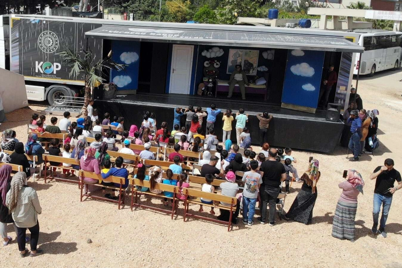 5 gün süren turnede ‘Kurbağa Vırak’ isimli çocuk oyunu sahnelendi. Sanayi ve Teknoloji Bakanlığına bağlı Konya Ovası Projesi (KOP) Bölge Kalkınma İdaresi Başkanlığı tarafından 2019 yılında finansman desteği verilen ve Konya Devlet Tiyatroları işbirliğinde sürdürülen KOP ile Gönül Havzası Sahnede projesi, Türkiye’yi derinden etkileyen deprem felaketinin ardından çocukların yüzünü güldürmek için perdesini araladı. Aksaray, Karaman, Kırıkkale, Kırşehir, Konya, Nevşehir, Niğde ve Yozgat’tan oluşan KOP Bölgesinde maddi imkansızlık ya da farklı nedenlerden dolayı tiyatro izleme fırsatı bulamayan çocuklarda ve vatandaşlarda tiyatro farkındalığını oluşturmak ve yaşatmak amacıyla hayata geçirilen proje yaşanan asrın felaketinin ardından deprem bölgesindeki çocuklara moral oldu, yüzlerini güldürdü. Osmaniye’den başlayarak İskenderun, Antakya ve Hassa’da çocuklarla buluşan KOP Gönül Havzası Tır’ı ile Konya Devlet Tiyatroları oyuncuları, Kutlay Akbal’ın yazdığı ve Özgür Baş’ın yönetmenliğini üstlendiği "Kurbağa Vırak" çocuk oyununu sahneledi. Tiyatro oyuncusu Yıldırım Bayazıt, Konya Devlet Tiyatrosu’nun KOP İdaresi Başkanlığı ile ortaklaşa yürüttüğü deprem bölgesindeki çocuklara dokunma projesinde Hatay’da olduklarını belirterek, “Günlerdir sahadayız. Amacımız, burada deprem bölgesinde moral değerlerin en üst seviyeye çıkarılması, çocuklarımıza drama etkinlikleri, onun yanı sıra çocuk oyunlarımızla yer yer Karagöz-Hacivat etkinliklerimizle onlarla beraber olup, onları eğlendirebilmek, bir nebze de olsa depremin negatif etkinlerini onların üzerinden atabilmeye çalışmak. Bu arada biz tabii KOP’a ayrıca teşekkür ediyoruz. Çünkü bizim her türlü lojistik desteğimizi sağlıyorlar ve tek yürek olduk ülkemiz adına. Burada olmaktan son derece memnunuz. Çocuklarımıza dokunabildiğimiz sürece hep beraber daha güzel günlere umut ediyoruz ki yürüyeceğiz” dedi. Kurbağa Vırak’ı canlandıran tiyatro oyuncusu Burçin Nar da, “Oyunumuz Kurbağa Vırak isimli bir çocuk oyunu. Ben de Kurbağa Vırak’ı oynuyorum. Çocukların oyuncaklarına kötü davranması, daha sonra onların değerini anlamasını anlatan bir çocuk oyunu. Çok güzel bir şey yapıyoruz ama tabii içimiz çok buruk. Buradaki çocukların durumunu gördükçe, insanların durumunu gördükçe tabii ki çok üzülüyoruz ama yine de bir moral olmak bizi mutlu ediyor” dedi. Çocuklar da oyunu beğendiklerini, oyuncakları düzgün kullanmak gerektiğini anlattığını ifade ederek, herkese teşekkür ettiler.