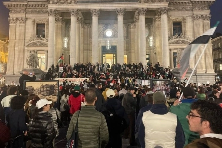 Brüksel'in merkezinde yer alan tarihi Borsa Binası önünde akşam saatlerinde bir araya gelen yüzlerce kişi, İsrail'in Gazze'ye saldırılarını ve ablukasını protesto etti.