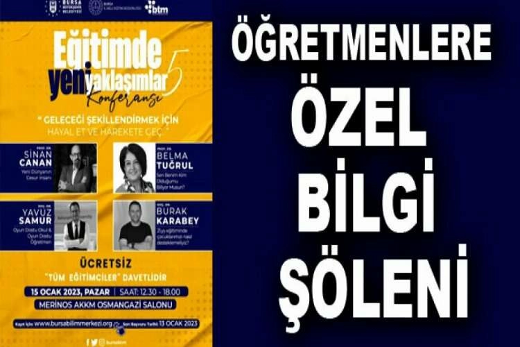 Büyükşehir Belediyesi’nin “Geleceği Şekillendirmek için Hayal Et ve Harekete Geç” temasıyla bu yıl 5’incisini düzenleyeceği Eğitimde Yeni Yaklaşıklar Konferansı, 15 Ocak 2023 Pazar günü 12.30 ile 18.00 saatleri arasında Atatürk Kongre ve Kültür Merkezi Osmangazi Salonu’nda gerçekleştirilecek. Bursa’daki tüm eğitimciler ve eğitime gönül verenlere açık olan ücretsiz konferansta, Prof. Dr. Sinan Canan, Prof. Dr. Belma Tuğrul, Doç. Dr. Yavuz Samur ve Doç. Dr. Burak Karabey, sunumlarıyla eğitim modellerinde yeni yaklaşımları ele alacak.