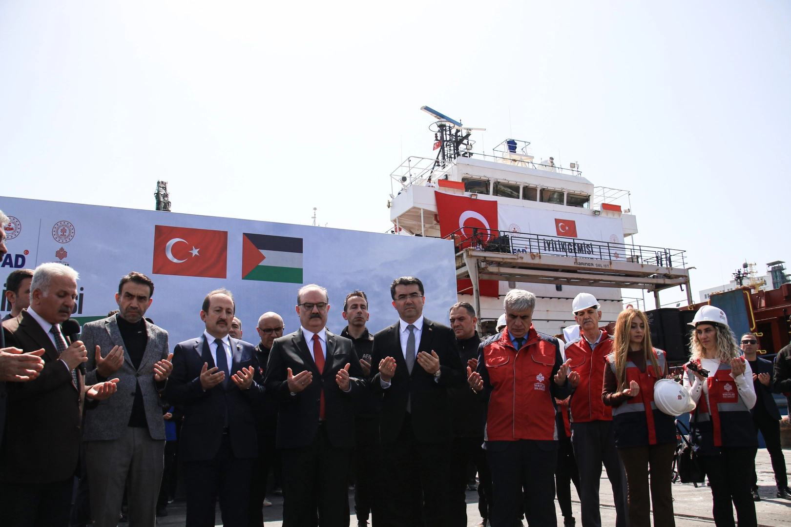 "Milletimiz karınca kararınca her türlü imkanını seferber etti" Kültür ve Turizm Bakan Yardımcısı Serdar Çam, Mersin Limanı'nda düzenlenen törende devlet olarak, Türkiye Cumhuriyeti olarak, Cumhurbaşkanı Recep Tayyip Erdoğan'ın liderliğinde yıllardır Gazze meselesine ve Filistin davasına büyük katkılar vermeye çaba gösterildiğini söyledi. Bugün de aynı şekilde bu çalışmaların artırılarak devam ettiğine işaret eden Çam, şöyle konuştu:
