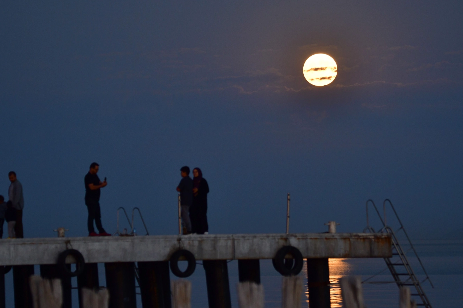 Bitlis’in Ahlat ilçesinde akşam saatlerinde iskele üzerinde beliren dolunay, Van Gölü üzerinde oluşturduğu yakamozla izleyenlere adeta görsel bir şölen yaşattı.