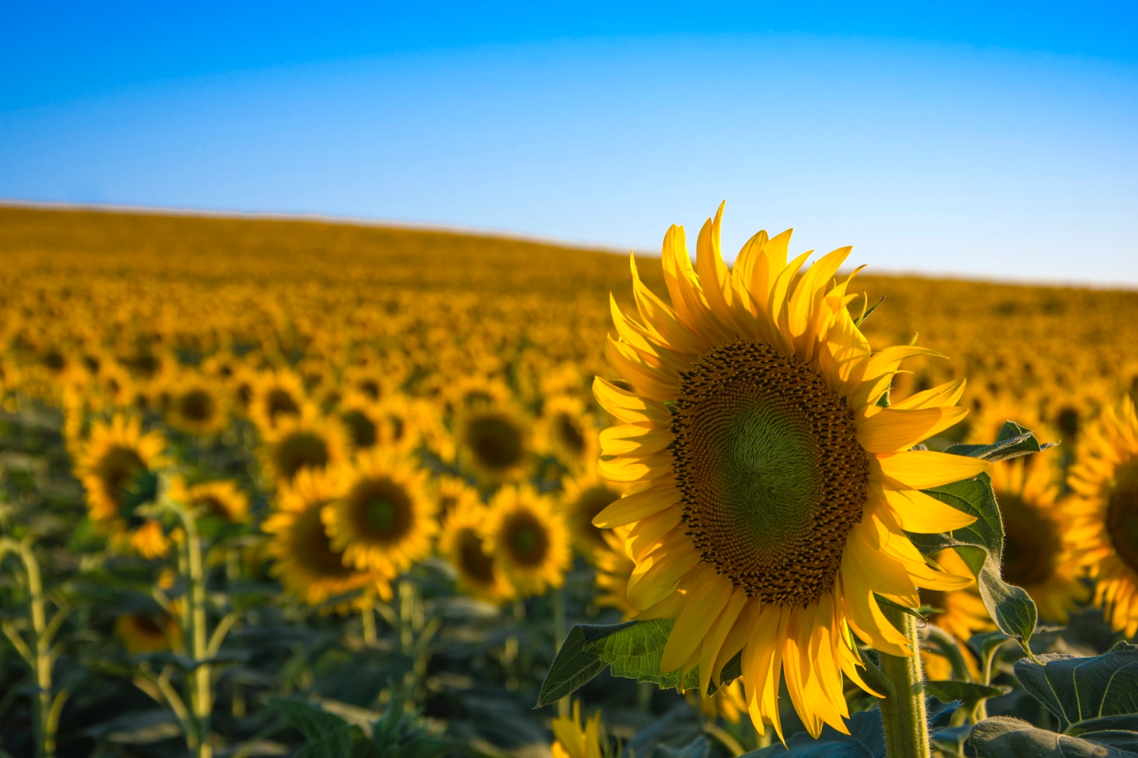 Ayçiçeğinin sarı rengi ve renkli görüntüleri, gökyüzünün mavisiyle birleşerek eşsiz bir manzara sunuyor.