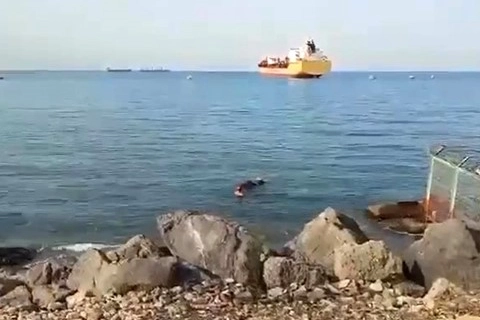 Hatay'ın Akdeniz açıklarında gemiden denize düşen angus, yüzerek karaya ulaştı.