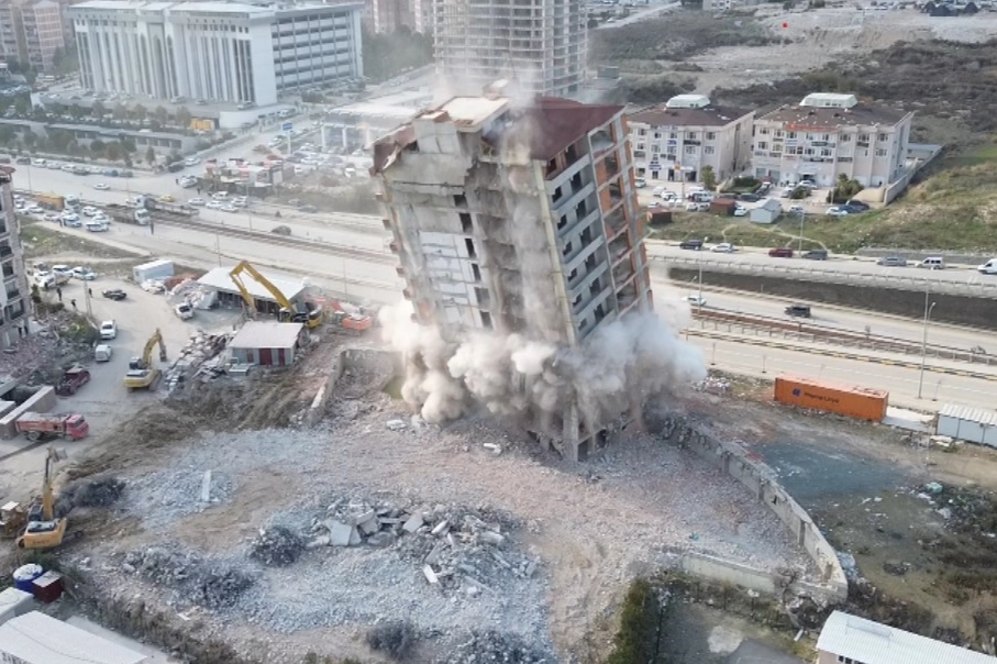 Kontrollü olarak yıkılan binanın yerle bir olduğu anlar havadan görüntülendi. Kahramanmaraş merkezli depremlerde ağır hasar alan Hatay'da mahkeme süreci sona eren binaların yıkım ve enkaz kaldırma çalışmaları aralıksız sürüyor. Antakya ilçesi Akasya Mahallesi'nde bulunan 14 katlı bina, iş makinesinin halat yardımıyla kontrollü olarak yıkıldı. 14 katlı binanın yıkımı esnasında herhangi bir olumsuzluk yaşanmazken binanın yıkımı havadan görüntülendi. 14 katlı binanın yıkımını izleyen vatandaşlar, binanın yıkım esnasında deprem etkisi yaşatarak sarsıntı oluşturduğunu söylediler.