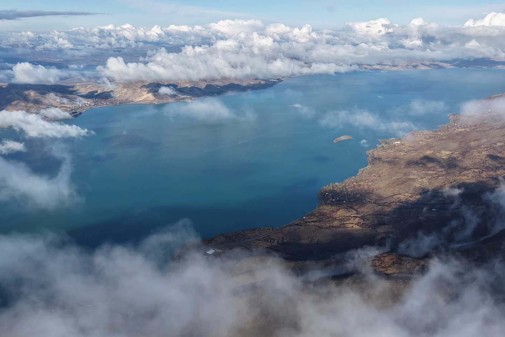 Elazığ'da karla kaplı Hazarbaba Dağı ve eteğindeki Hazar Gölü, bulutlarla birlikte kartpostallık görüntüler oluşturdu.