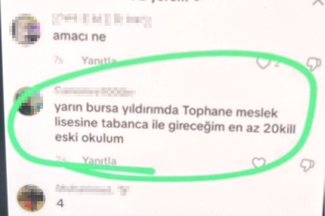 Edinilen bilgiye göre, İl Emniyet Müdürlüğü Asayiş Şube ekipleri, bir sosyal medya platformunda Bursa’da bir okulun ismini vererek saldırı planladığını yazan kullanıcı üzerine çalışma başlattı. Yapılan incelemelerde söz konusu hesabın Ü.O. (16) isimli şahsa ait olduğu belirlendi. Şüpheli, ekipler tarafından ikametinde gözaltına alındı. Emniyetteki işlemlerinin sürdüğü öğrenildi. Öte yandan, Şanlıurfa ve Kahramanmaraş’ta yaşanan okul saldırılarının ardından bir paylaşımın altına "sıra bende" şeklinde yorum yapan bir başka kişinin de Bursa’da yaşadığı tespit edildi. Kimliği belirlenen Y.İ. (19), polis ekiplerince düzenlenen operasyonla yakalanarak gözaltına alındı. Şüphelinin evinde yapılan aramalarda 2 adet kurusıkı tabanca, bu silahlara ait 24 mermi, 3 havalı tabanca ile 21 adet oyuncak tabanca ve tüfek ele geçirildi. Gözaltına alınan Y.İ.’nin ilk ifadesinde paylaşımları "şaka ve mizah" amacıyla yaptığını söylediği, olayın bu kadar ciddiye alınacağını öngöremediğini dile getirdiği öğrenildi. Ele geçirilen silahları ise "merak ve ilgi" nedeniyle bulundurduğunu beyan ettiği belirtildi. Olayla ilgili soruşturma sürerken, emniyet yetkilileri sosyal medya üzerinden yapılan bu tür paylaşımların ciddi sonuçlar doğurabileceğine dikkat çekti.