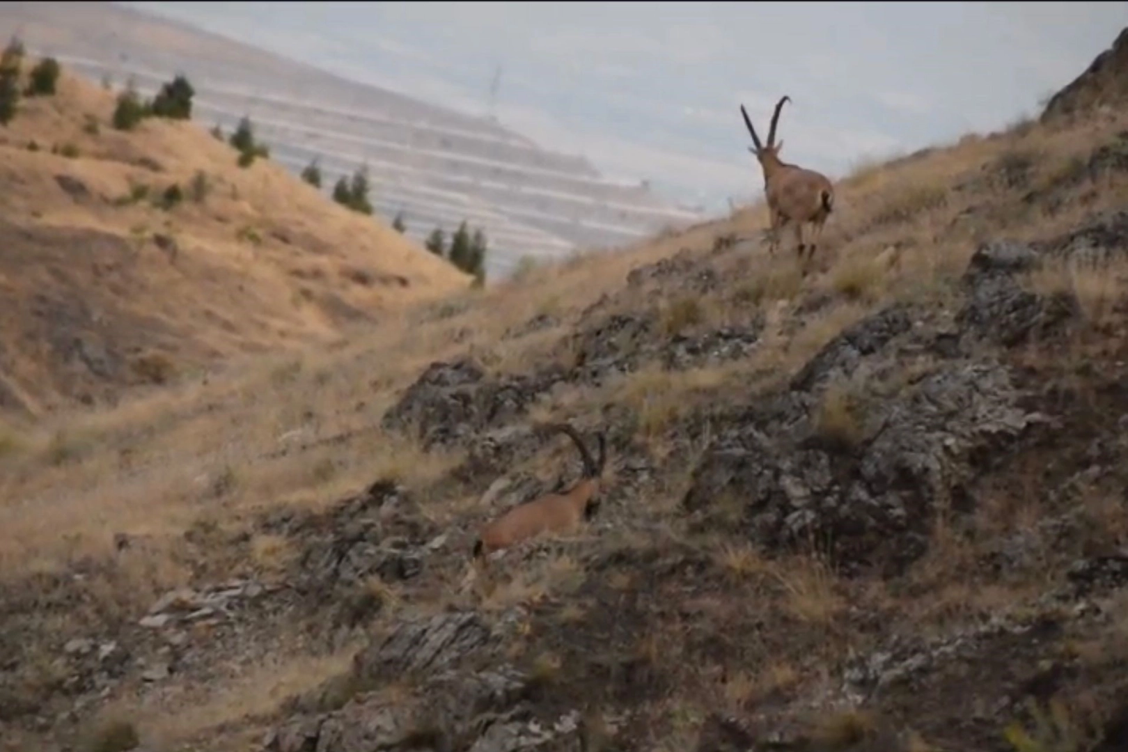 Dağlık alanda otlanan iki boynuzlu dağ keçisi, doğasever tarafından görüntülendi. Çekilen görüntülerde keçiler, otlandıktan bir süre sonra gözden kaybolduğu görülüyor.