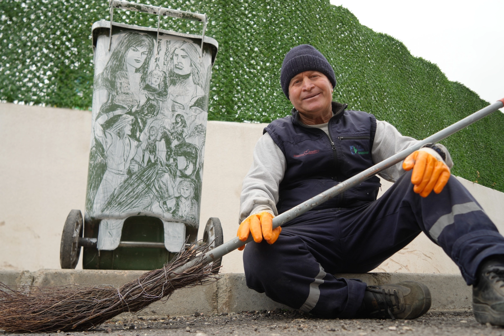Kocaeli'de çobanlıktan belediyede temizlik işçiliğine uzanan hayatında sanatı yaşatan 60 yaşındaki Selami Gündoğdu, süpürgenin çalısını kalem gibi kullanarak konteynerlere Türk sinemasının unutulmaz isimleri ile çizgi roman karakterlerini resmediyor.
