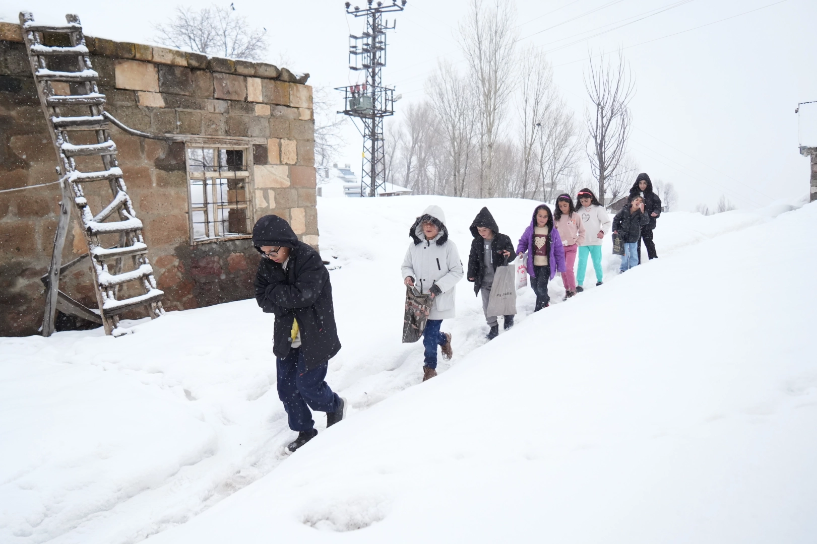 Muş’un Yukarı Yongalı köyünde çocuklar, metrelerce kar üzerinde kapı kapı dolaşarak şeker topladı.