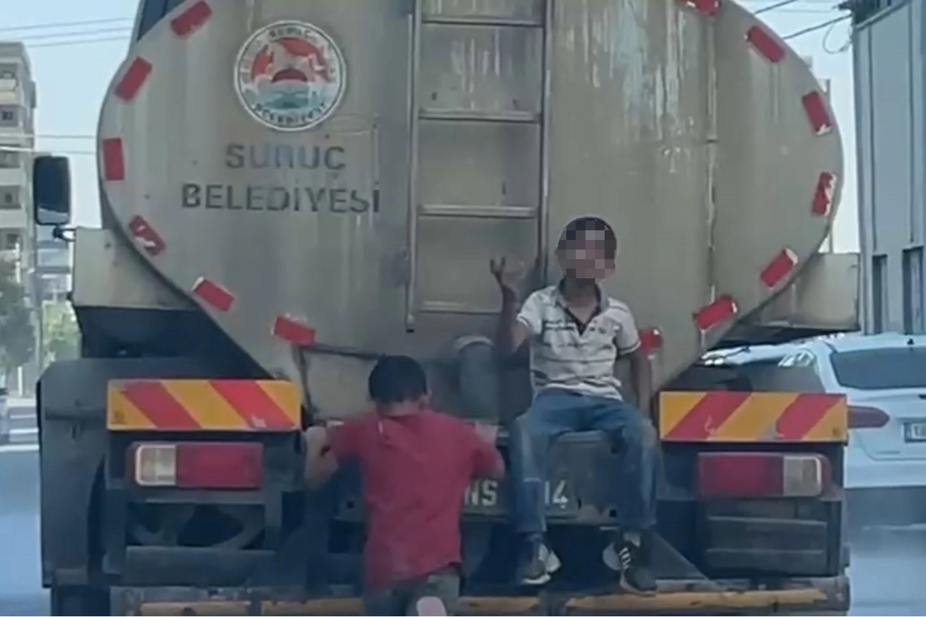 Şanlıurfa’nın Suruç ilçesinde çocukların trafikte seyir halinde olan araçların arkasına tutunarak yolculuk yapmaya çalışması yürekleri ağızlara getirdi. Suruç Belediyesinin yol sulama tankerine tutunan çocuklar, arka kısımda yer alan demire oturarak yolculuk yapmaya çalıştı. Tankerin arkasından seyreden bir araçtan çekilen görüntüde, çocukların tehlikeye aldırış etmedikleri gözlendi. Cep telefonuyla görüntülendiklerini fark eden çocuklar, atlayarak uzaklaştı. Bir diğer görüntüde ise seyir halindeki kamyonun kasasına tutunan çocuk, uzun süre yolculuk yaptı. İnmeye çalışan çocuğun düşme tehlikesi atlatması ise yürekleri ağızlara getirdi.