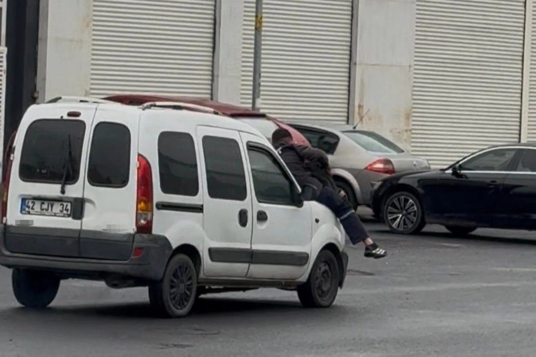 Seyir halindeki aracın kaput kısmına oturan usta, buradan gelen sesin kaynağını bulmaya çalıştı. O anlar cep telefonu kamerasına yansırken, izleyenler kendilerini gülmekten alamadı.