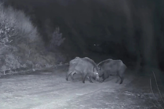 Tekirdağ'da Ganos Dağları'nda fotokapan kamerasına yansıyan görüntülerde, aynı anda kameranın iki farklı noktasında kavga eden domuzlar ilginç anlara sahne oldu.