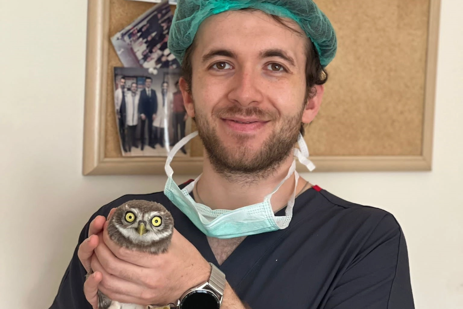 Bolu'dan Eskişehir'e giden Estetik ve Plastik Cerrahı Erkan Yanıkoğlu, yol kenarında uçamayan kukumav kuşu buldu. Yanıkoğlu, kliniğinde kukumav kuşunun bakımlarını yaptıktan sonra evinde besledi.
