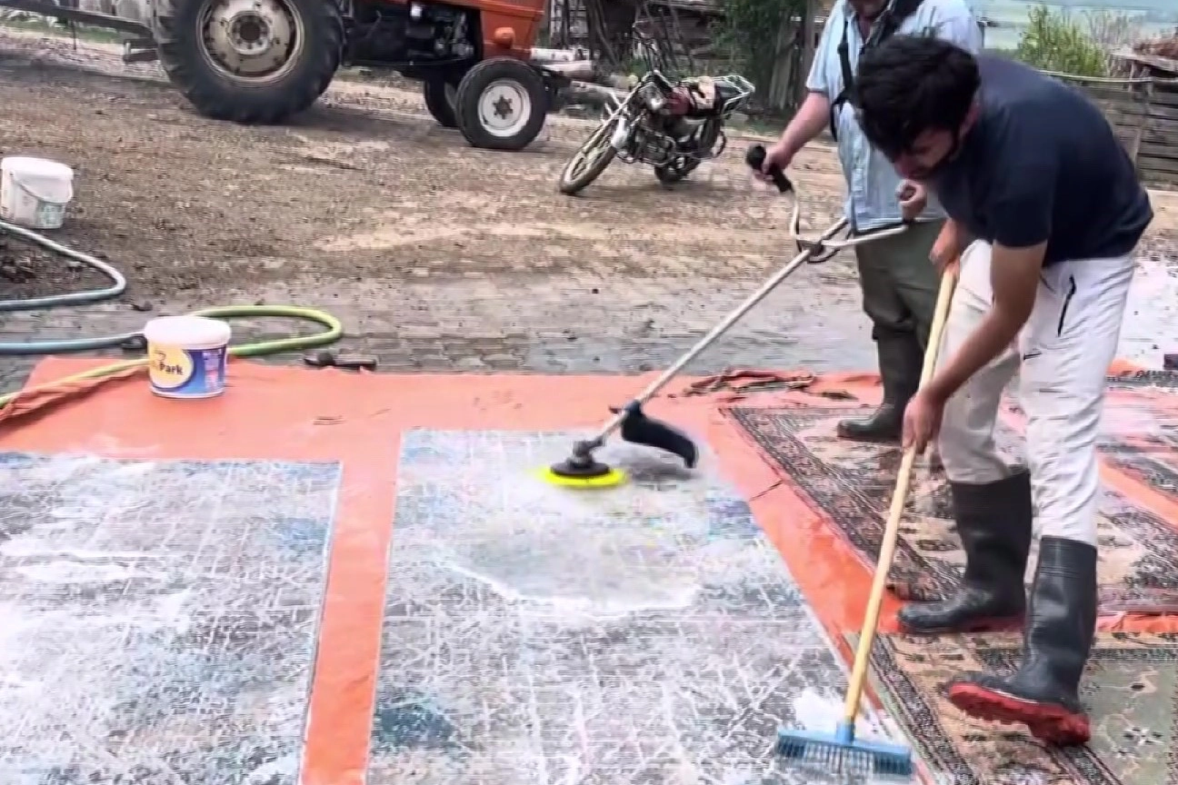 Tozunu alıp suyla ıslayarak temizleyici döktükleri halının üstünde tırpanın korumalığı sayesinde su sıçratmadan ot biçer gibi manevra yaptıklarını anlatan Karakuş, "Halı yıkamada çığır açtık. Köyümüzün eskileri bu görüntüleri görseydi çok şaşırırdı" diye konuştu.