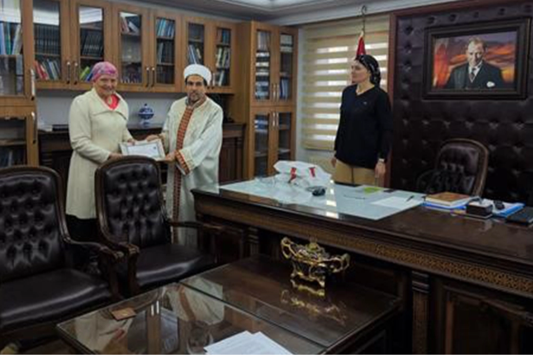 Müslüman olan Louisa Maria Petronella Sturkenboom’a İlçe Müftüsü Taner tarafından ihtida belgesi ile Kur’an-ı Kerim ve Felemenkçe Kur’an Meali başta olmak üzere hediyelerini takdim etti.