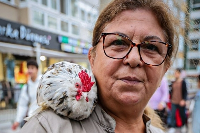 İzmir'de yaşayan 64 yaşındaki Hatice Suner, 9 ay önce gurktan çıkardığı İsveç cinsi 'Bıdık' isimli horozunu omzuna alarak İzmir sokaklarını karış karış geziyor. Her yere birlikte gittiklerini belirten Suner, "Kendim çıkardım gurktan. Civcivken koynumda büyüttüm, evde bakıyorum. İsveç cinsi ufak bir horoz, bu kadar büyüyor. Başka hayvanlarım da var ama bu böyle özel çıktı" dedi.
