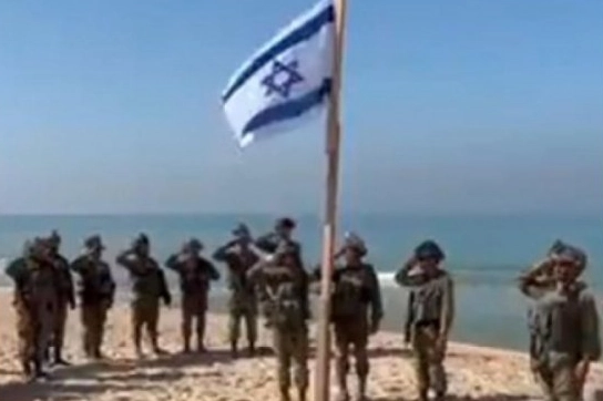 Söz konusu görüntüde, İsrail askerlerinin sahile İsrail bayrağı çekerek ulusal marşlarını okuduğu görülüyor