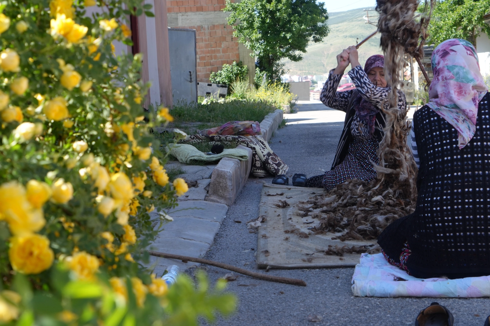 Yünler hünerli ellerde 4-5 aşamadan geçiyor "Yün" denilince akla gelen mahallerden biri olan Şingah Mahallesi sakinlerinden Zübeyde Tutar, komşusu Emine Oruç ile birlikte evlerinin önünde yün çırpma işini sürdürürken, bu sürecin detaylarını anlattı. Tutar, "Yünlerimizi leğenlerde yıkıyoruz, ondan sonra çuvallarla süzdürüyoruz. Ertesi gün çırpıyoruz. Yünlerimizi kıtır, yorgan, minder, küstüm yapıyoruz. Yün mesaimiz iki gün sürüyor. Bir gün yıkıyoruz, ertesi gün çırpıyoruz, kurutuyoruz, dolduruyoruz. Ondan sonra da minderlerimizi, yorganlarımızı sırımaya veriyoruz. Yün, çok aşamadan geçiyor. Yorganlarımız, kıtır dediğimiz döşekler sırıma işleminin ardından kullanılır hale geliyor" dedi.