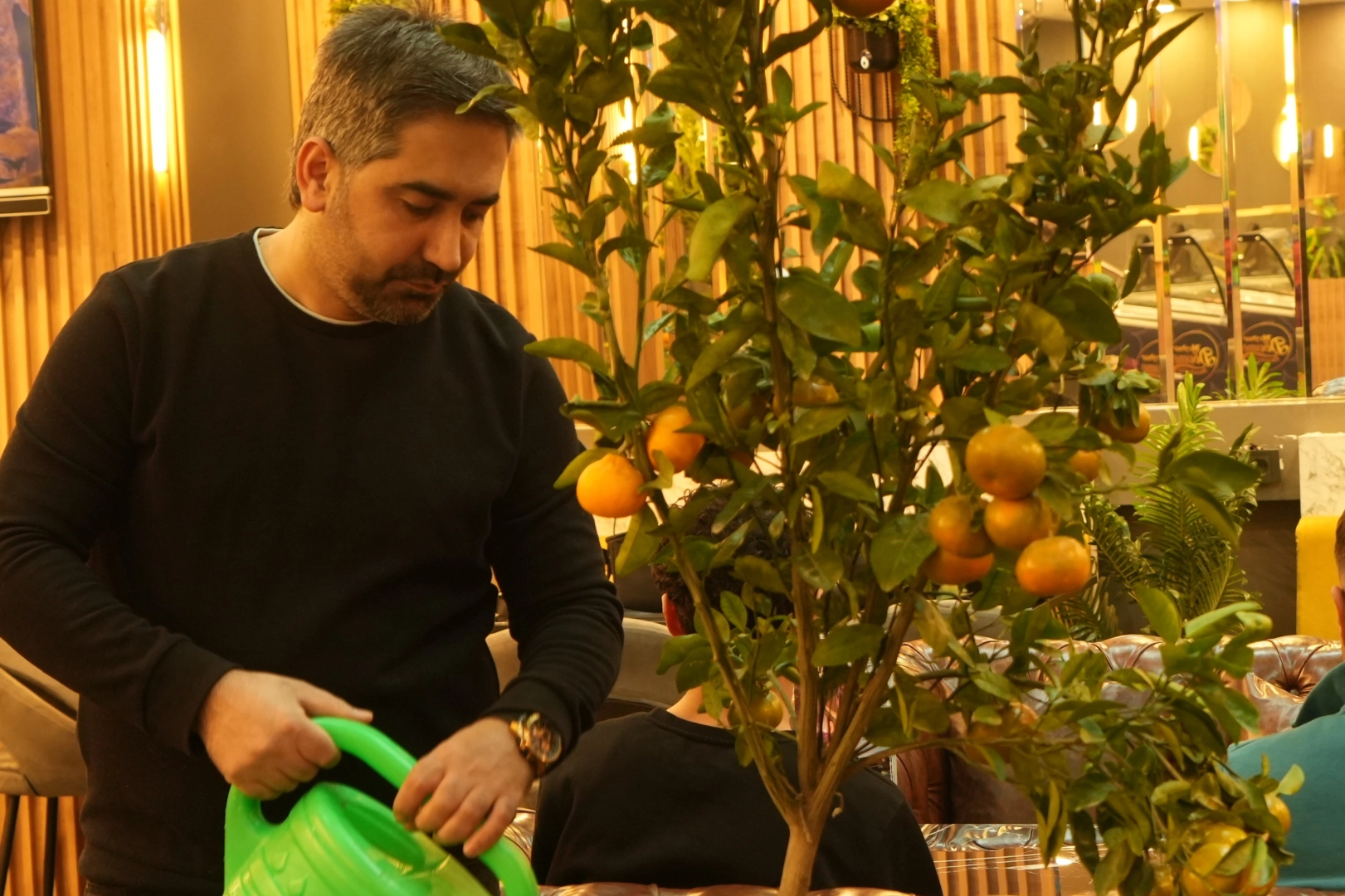 Muş'ta kafe işleten Nezir Yolcu, iş yerinde farklı bir yöntem deneyerek Siirt'ten getirttiği saksı içerisindeki mandalina fidelerini kafesinde yetiştirmeye başladı. Kısa sürede meyve veren fideler, müşterilerin yoğun ilgisini çekti. Fidelerle birebir ilgilenen Nezir Yolcu, düzenli olarak sulama yaparak bakımını üstlendi ve mandalina ağaçlarını özenle yetiştirdi. Kafedeki sıcak ve kontrollü ortamda gelişen fideler olgunlaştığında, meyveler müşterilere ikram edilmeye başlandı. Doğal bir atmosfer oluşturmayı hedeflediğini belirten Yolcu, uygulamanın beklediğinden daha fazla ilgi gördüğünü söyledi. Yolcu, kafede misafirlerine farklı bir deneyim sunmak istediğini ifade ederek, mandalina fidelerinin büyük beğeni topladığını söyledi. Yakında farklı meyve ağaçlarını da getirip burada yetiştirmeyi planladığını ifade eden Yolcu, "Burayı işletiyoruz. Böyle bir değişiklik olsun, bir farkındalık oluşturalım dedik. Mandalina ağaçlarını biraz dışarıdan sipariş ettirdik. Daha önce de bakımını yapmıştık zaten. Hem manzara olarak güzel oluyor hem de tadı tamamen orijinal ve doğal. Hiçbir gübre verilmemiş bunlara. Müşterilerimiz de bundan çok memnun. Bizim de hoşumuza gidiyor" dedi.