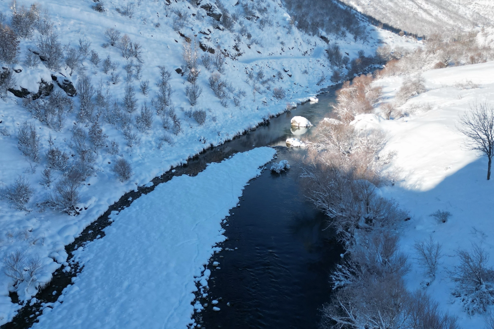 Havadan görüntülenen Habur Çayı ve ağaçların yanı sıra köylerin güzelliği göz kamaştırdı. Kar kalınlığının yer yer 2 metreyi bulduğu ilçede doğanın beyaz rengi ile su birleşince göz kamaştıran görüntüler ortaya çıktı. Masalsı görüntülerin adresi Şırnak oldu.