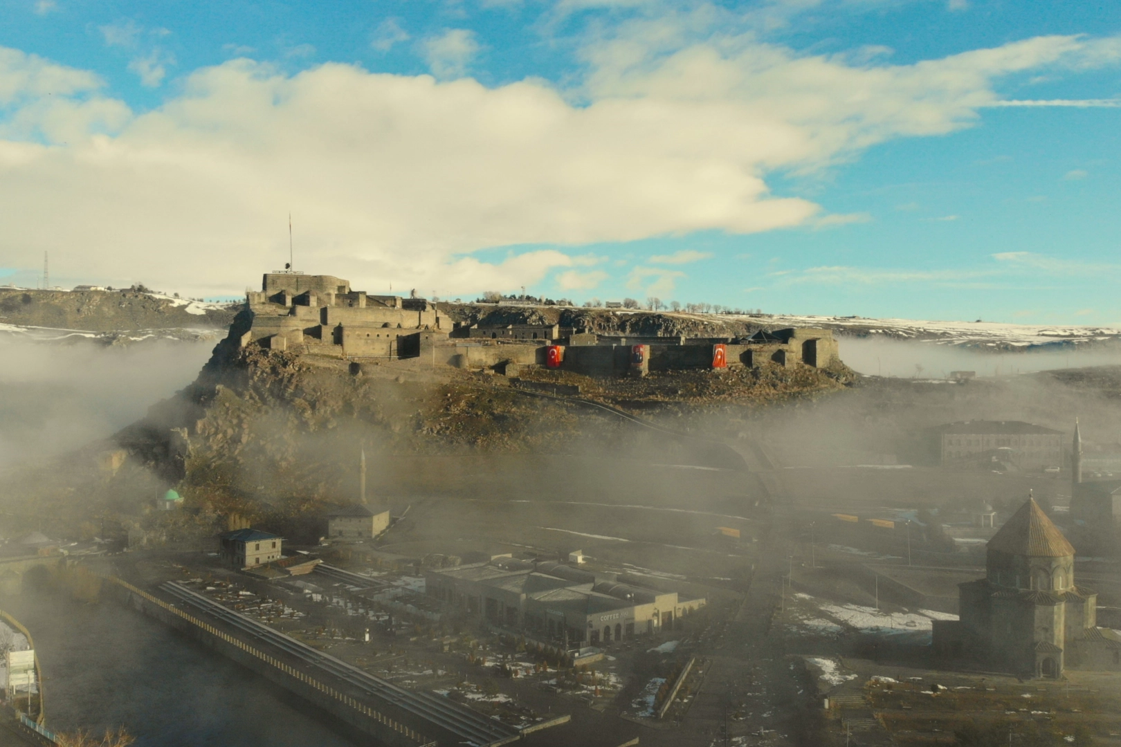 Kars’ta sadece kale etrafında etkisini gösteren sis, tarihi yapıları gizlerken ortaya kartpostallık manzaralar çıkardı. Kent merkezine hakim konumda bulunan Kars Kalesi, sis bulutlarının arasında zaman zaman görünmez hale geldi. Aynı karede yer alan tarihi kilise ve Evliya cami ise sisin arasından siluet şeklinde belirdi. Ortaya çıkan görüntüler, kentin tarihi dokusunu farklı bir atmosferle buluşturdu.