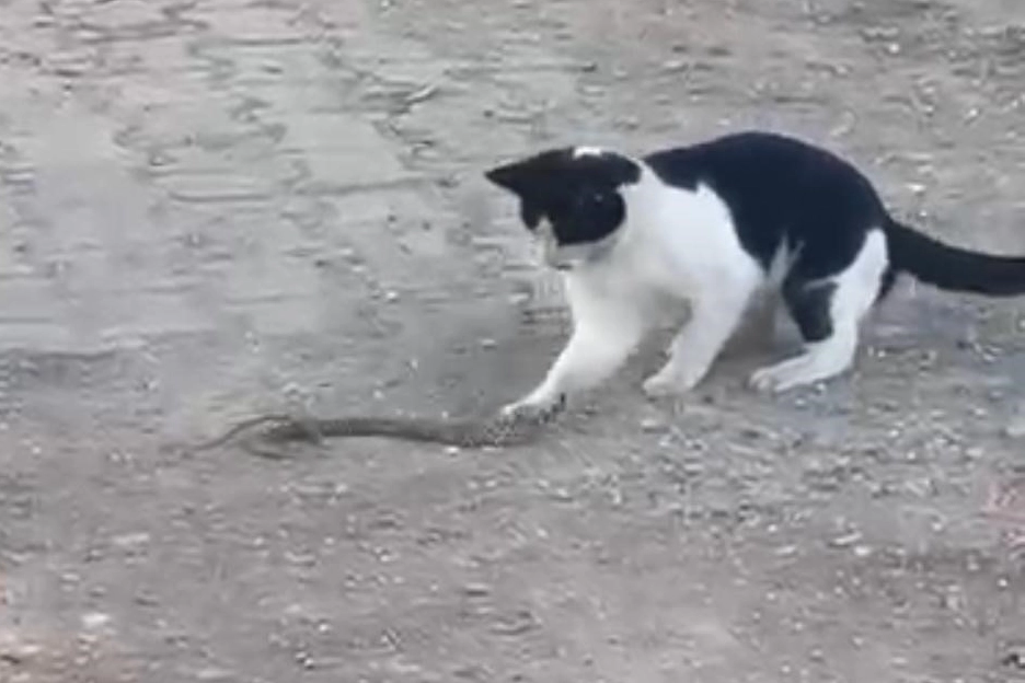 Siirt'in Kurtalan ilçesinde kedi, fareyle oynar gibi yılanla bir süre oynadıktan sonra, hayvanı ağzıyla kapıp uzaklaştı.