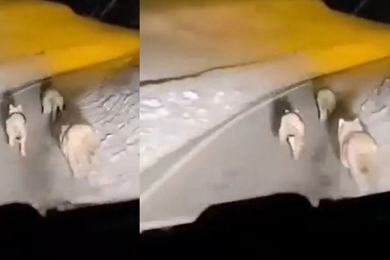 O anları kayda alan sürücüler, kurtların bir süre yol kenarında ilerledikten sonra gözden kaybolduğunu belirtti.