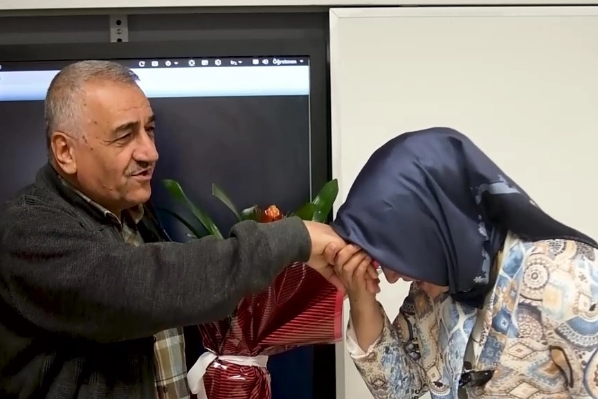 Hatay'da öğrenim gördüğü okula öğretmen olarak atanan Esra Sultan Kaya, Öğretmenler Günü'nde kendi öğretmenini öğrencileriyle birlikte sınıfında ağırladı.