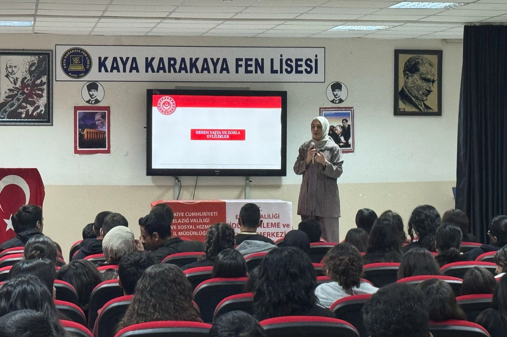 Elazığ Sosyal Hizmetler İl Müdürlüğü Şiddet Önleme ve İzleme Merkezi (ŞÖNİM) eğitimcileri tarafından Kaya Karakaya Fen Lisesi ve Ahmet Kabaklı Fen Lisesi'nde öğrenim gören öğrencilere, 'Kadına Şiddet' konulu bilgilendirme eğitimi düzenlendi. Eğitimde, kadına yönelik şiddetin hem somut hem de soyut boyutları ele alındı. Eğitimciler, fiziksel, psikolojik ve ekonomik şiddet türleri hakkında öğrencilere detaylı bilgiler aktardı. Ayrıca devletin kadına yönelik şiddeti önlemeye yönelik uyguladığı yasal düzenlemeler ve koruyucu tedbirler de anlatıldı.