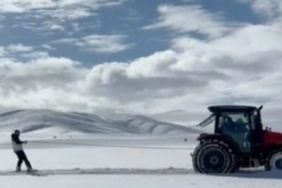 Kayseri'nin Pınarbaşı ilçesi İnliören köyünde besici Ramazan Gök, traktörün arkasına bağladığı snowboard ile karın keyfini çıkardı.