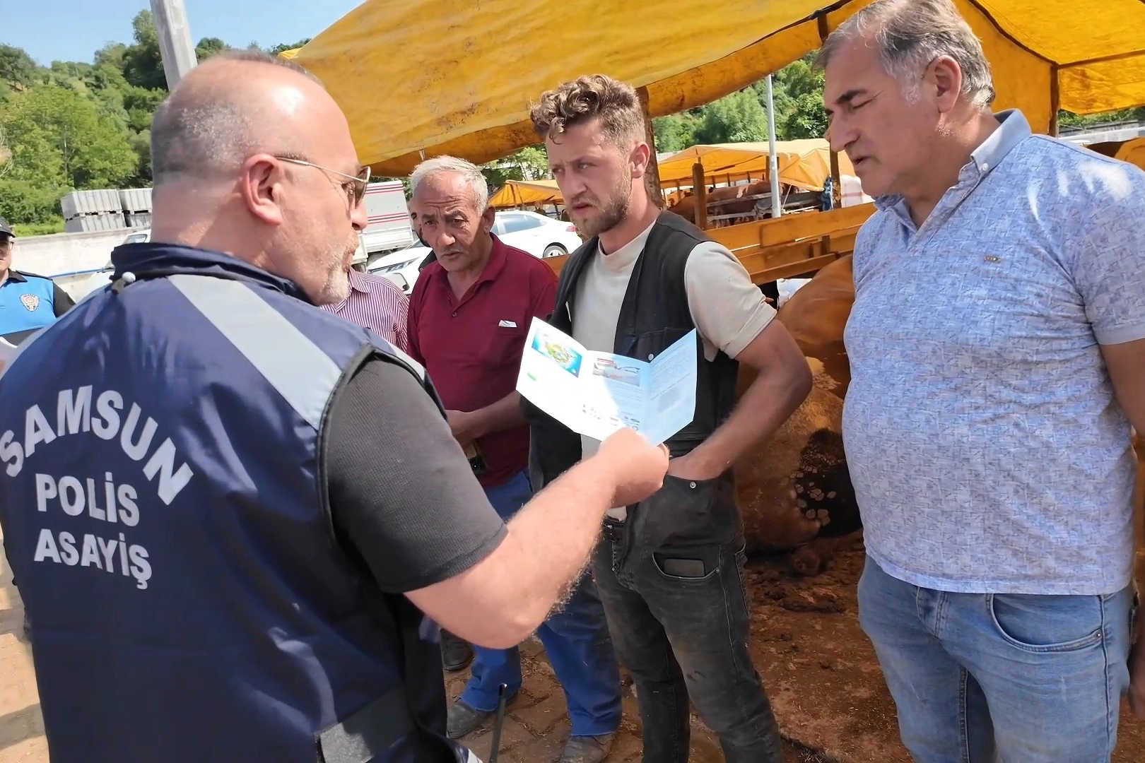 Samsun İl Emniyet Müdürlüğü’ne bağlı Toplum Destekli Polislik, Asayiş ve Kaçakçılık ve Organize Suçlarla Mücadele Şube Müdürlüğü ekipleri tarafından Kurban Bayramı tedbirleri kapsamında hayvan pazarlarında bilgilendirme yapıldı.