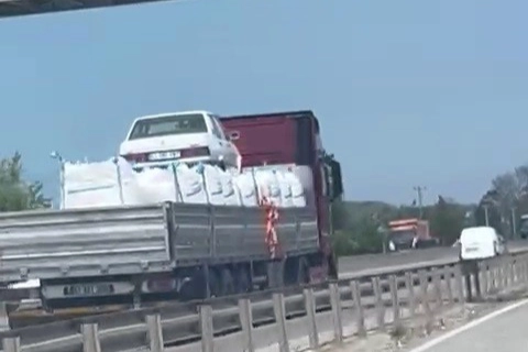 Sakarya D-650 kara yolunda seyir halinde çuval yüklü tırın üstünde otomobil taşındığını görenler hayrete düştü. Cep telefonu kameralarına yansıyan olayda, ilginç manzarayı gören dönüp bir daha baktı.