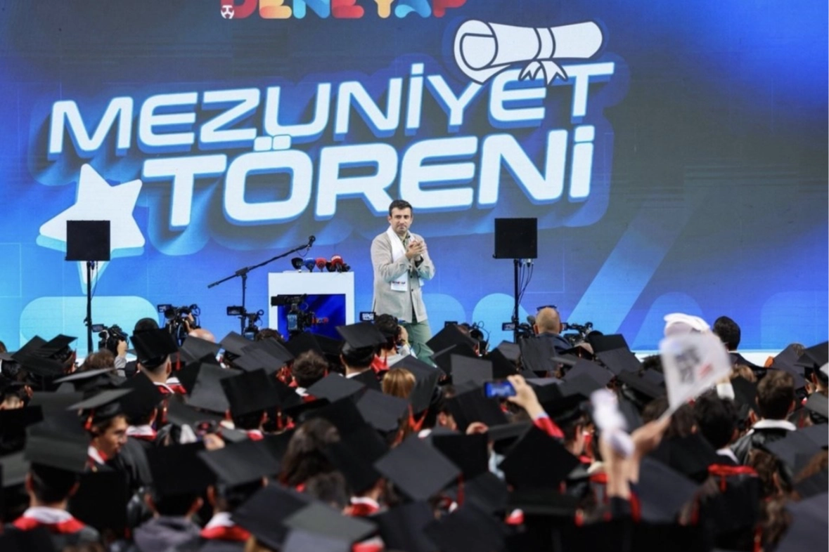 81 ilde eş zamanlı gerçekleştirilen mezuniyet törenlerinin en geniş katılımlı etkinliklerinden biri olan ve yaklaşık 3 bin kişinin katıldığı törende bin öğrenci, üç yıl süren eğitim serüvenlerini tamamlamanın gururunu yaşadı. T3 Vakfı Mütevelli Heyeti ve TEKNOFEST Yönetim Kurulu Başkanı Selçuk Bayraktar mezuniyet töreninde yaptığı konuşmada, "Milli Teknoloji Hamlesi’nin bir neferi, bu yolculuğun ve bu büyük ailenin bir ferdi olarak, emeklerinizin meyvesini topladığınız bu güzel anın şahidi olmaktan gurur duyuyorum. Bugün burada sadece mezun olan öğrencilerimize değil bir umudun, bir hayalin ve bir milletin geleceğine bakıyoruz. Bugün, Türkiye'nin dört bir yanında, 81 ilimizde büyük bir coşku yaşıyoruz. 2018 yılında ektiğimiz tohumların dev çınarlara dönüştüğünü görüyoruz. Edirne’den Hakkari’ye, yurdumuzun her köşesinde, İstanbul’da, Ankara’da, Gaziantep’te DENEYAP atölyelerimizdeki eğitimlerini başarıyla tamamlayarak mezuniyet hakkını kazandı. Bir abiniz ve yol arkadaşınız olarak özelikle vurgulamak istediğim daha da önemli bir kazanım var. İleride dünyaya damga vuracak işlerinizde yanınızda olacak kalıcı dostlar, yol arkadaşları kazandınız" diye konuştu. Yaptığı konuşmada gençlere seslenen Selçuk Bayraktar, "Bu atölyelerde kurduğunuz takım ruhunu ve arkadaşlıkları asla kaybetmeyin. DENEYAP ekosisteminde sizlere yol gösteren abilerinize, ablalarınıza ve birlikte yürüdüğünüz kardeşlerinize sımsıkı sarılın. Onları adeta ailenizin bir ferdi bilin. En önemli davamız olan Milli Teknoloji Hamlesi'nin motor gücü de işte bu takım ruhudur. Bu hamlenin asıl hedefi ise tam bağımsız, teknoloji geliştiren, paradigma değiştiren, oyun kuran bir Türkiye inşa etmektir. İşte bu hamlenin çekirdeği de ruhu da sizlersiniz. Bu güzel ülkenin geleceğinde sizlerin imzası olacak. Şimdi daha büyük hayaller kurmanın vakti. Hayattaki KIZILELMA’nız ufukta parlıyor. Sürekli merak edin ve sorgulayın. Sınırları zorlayın. Paradigmaları kırın. Başarısız olmaktan asla korkmayın ve pes etmeyin. Ve en önemlisi bu milletin evlatları olarak kendinize inanın. Burada öğrendiklerinizle TEKNOFEST'te kendi takımlarınızı kurmaya devam edin. DENEYAP mezunları olarak sizden ricam, sizden sonra gelen kardeşlerinize mentörlük yapmanız, bu meşaleyi söndürmeden taşımanızdır. Sizlerle bir arada olmaktan onur duyuyorum" şeklinde konuştu. "Yerli ve milli teknolojiler geliştiren Milli Teknoloji Hamlesine imza atan bir Türkiye var"