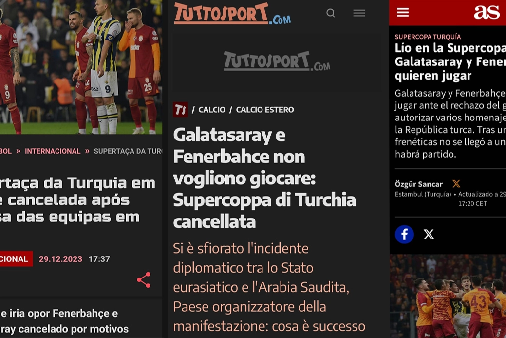 İtalyan Tuttosport’da da gerçekleşen maça çıkmama kararıyla ilgili yapılan haberde, “Riyad’da yapılması planlanan Türkiye Süper Kupası için geçerli olan ve yılbaşı arifesinde şampiyonun belli olacağı, Mauro Icardi’nin Galatasaray’ı ile Edin Dzeko’nun Fenerbahçe’si arasında oynanacak derbi maçı oynanmayacak. Her iki kulüp de İstanbul’a dönmüş olup, kupanın daha sonra ileri bir tarihte oynanacak şekilde iptal edilmesine karar verildi” şeklinde paylaşıldı.