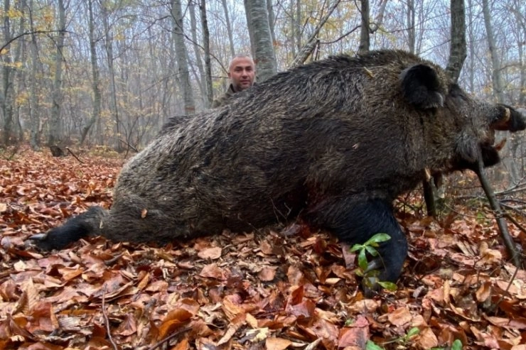 Tarım ve Orman Bakanlığı'ndan alınan iznin ardından araziye çıkan avcılar, Turhal Devlet Avlağı bölgesinde uzun takibin ardından bir domuz avladı.