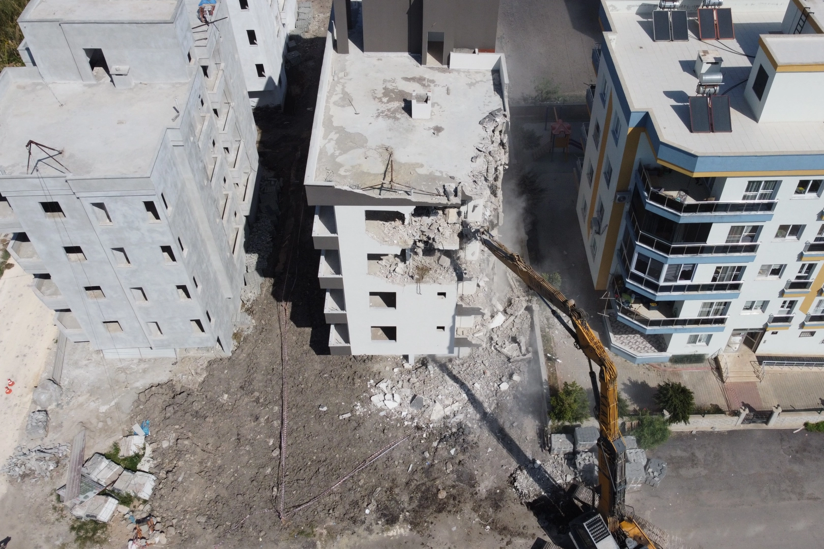 Mersin'in Erdemli ilçesinde yeni yapılan ve yana doğru yatan 4 katlı binanın, belediye ekipleri tarafından mühürlenmesinin ardından bugün yıkımına başlandı.