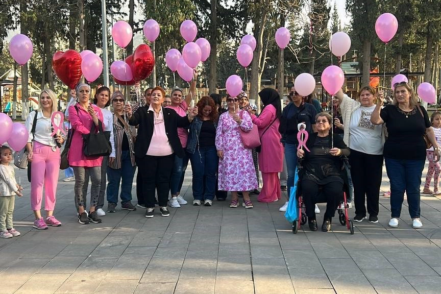 Hatay'da meme kanserine karşı zafer elde eden 55 yaşındaki Hatice Eryaşar, meme kanserine farkındalık oluşturmak amacıyla kadınlarla birlikte gökyüzüne pembe balon bıraktı.